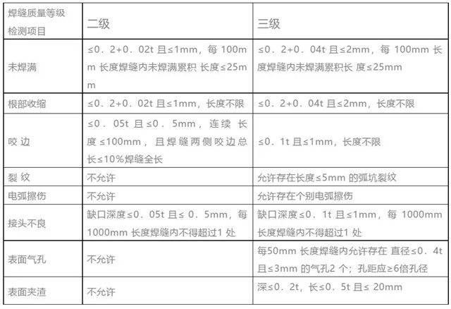 2) 對其他結(jié)構(gòu),焊縫的外觀質(zhì)量標(biāo)準(zhǔn)可為二級。